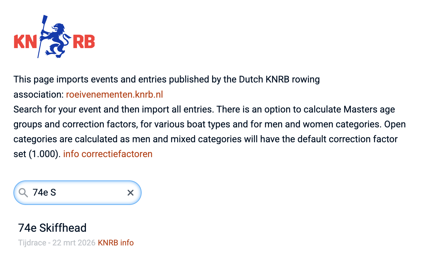 We've added a new import module for Dutch rowing races from the KNRB race entry system. In addition to the start list import, the proper age categories are determined for U23 as well as for Masters. These are included in the start list as a 'sub field'. Additionally, handicap factors are determined based on boat type as well on the average age of the crew. Here is a short demo video (in Dutch). (November '25)