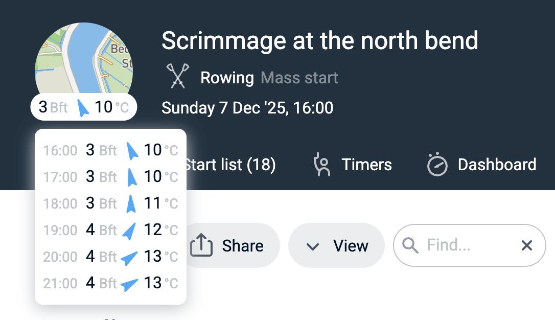 Race results now include a small historic weather widget on top of the map thumbnail. This applies only to races where the race manager has provided a location - as set with the map editor in race set up. Based on location, time and date the wind speed or wind force, wind direction and temperature data is provided. When clicked a list of weather conditions appeared ranging from the hour before the first time stamp until the hour after the last time stamp of the day. (December '25)